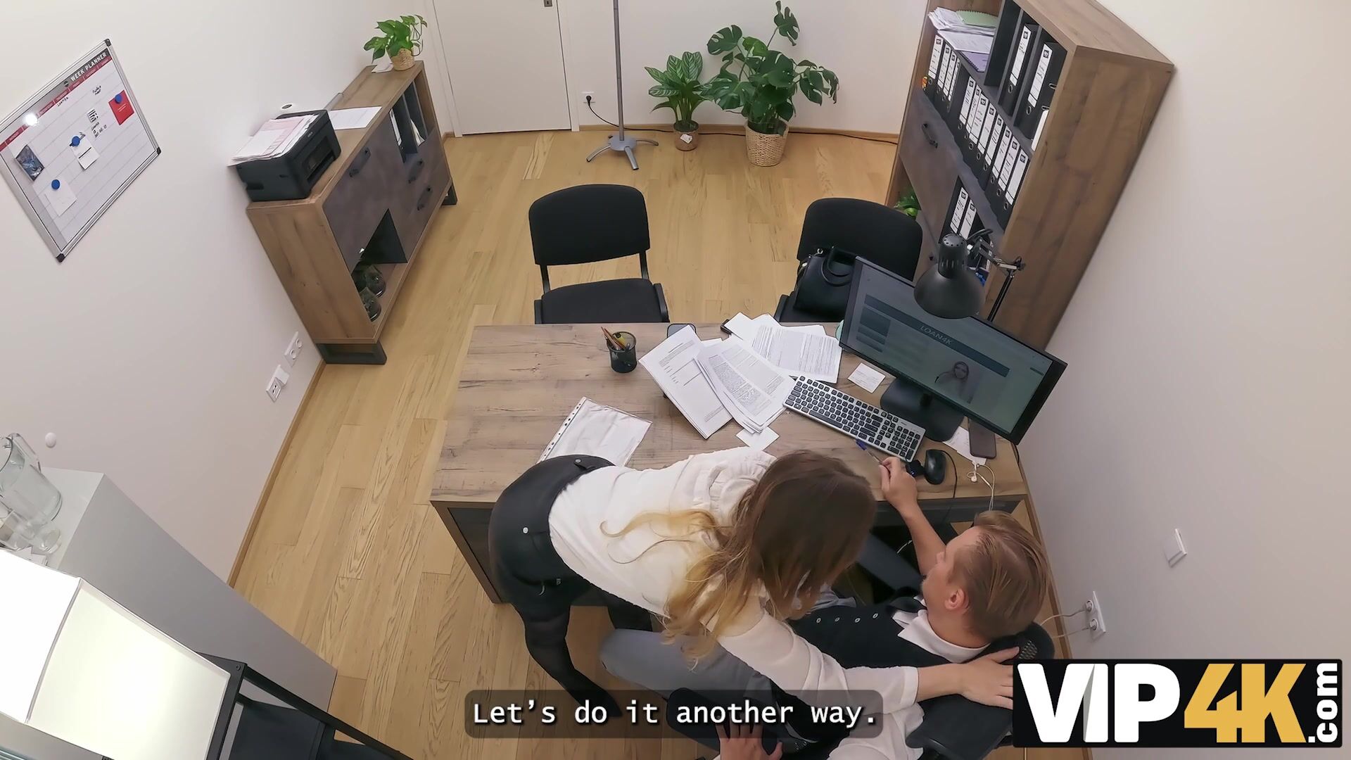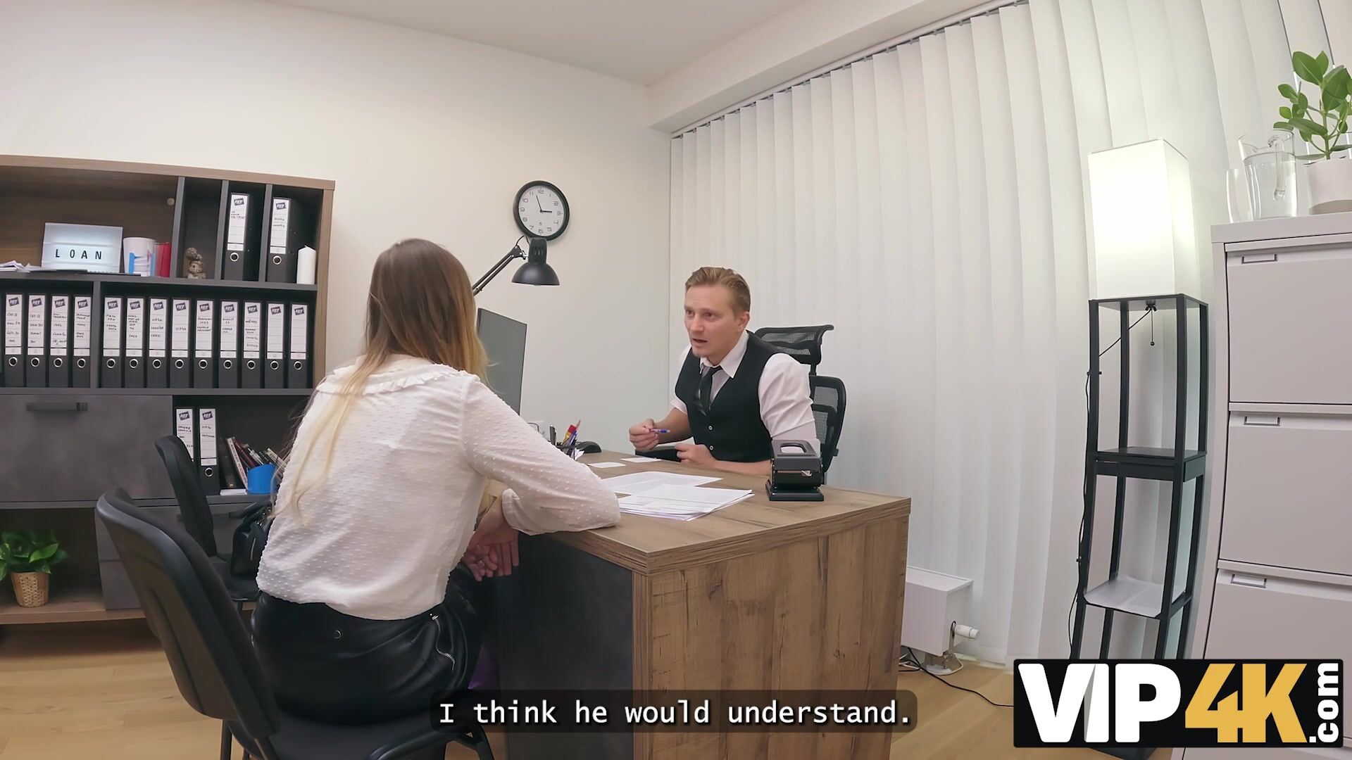 VIP4K. Blonde Maya with big tits is fucking a bank worker on the office. Hot interview with Maya